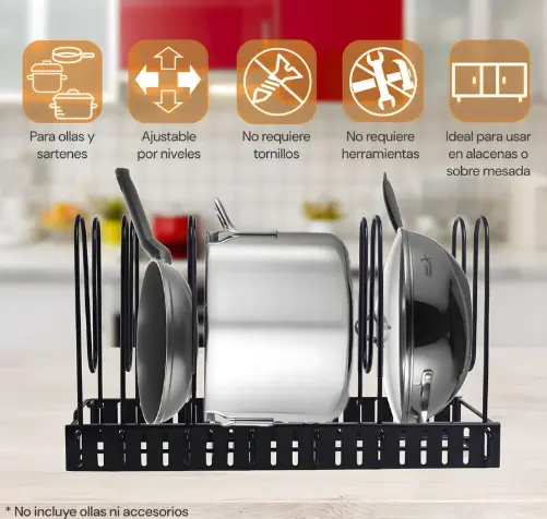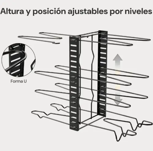 Gracias a sus divisores ajustables, podés configurar la altura de cada nivel según el tamaño de tus sartenes, ollas o tapas, manteniendo todo a la vista y evitando que tus piezas se rayen al estar apiladas.